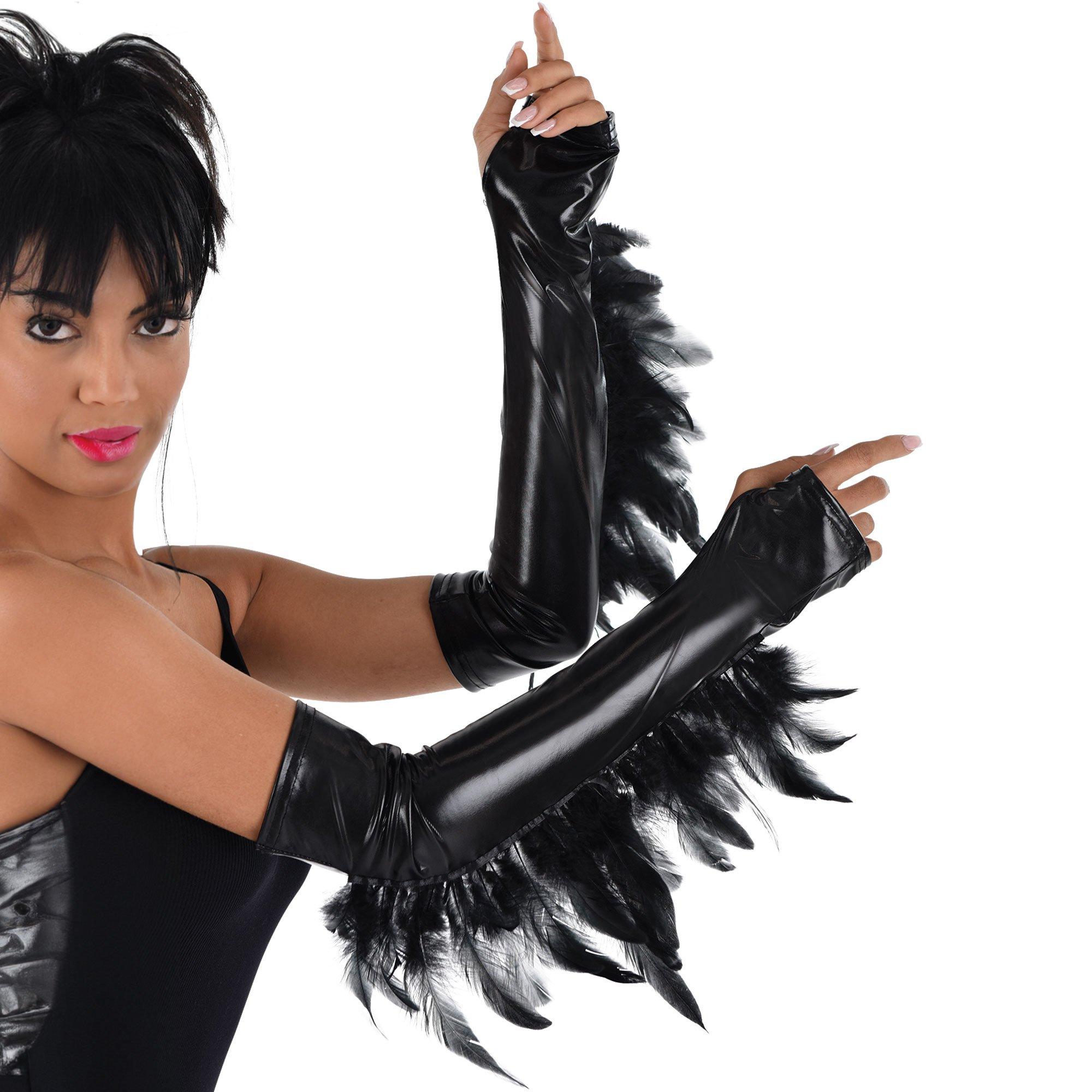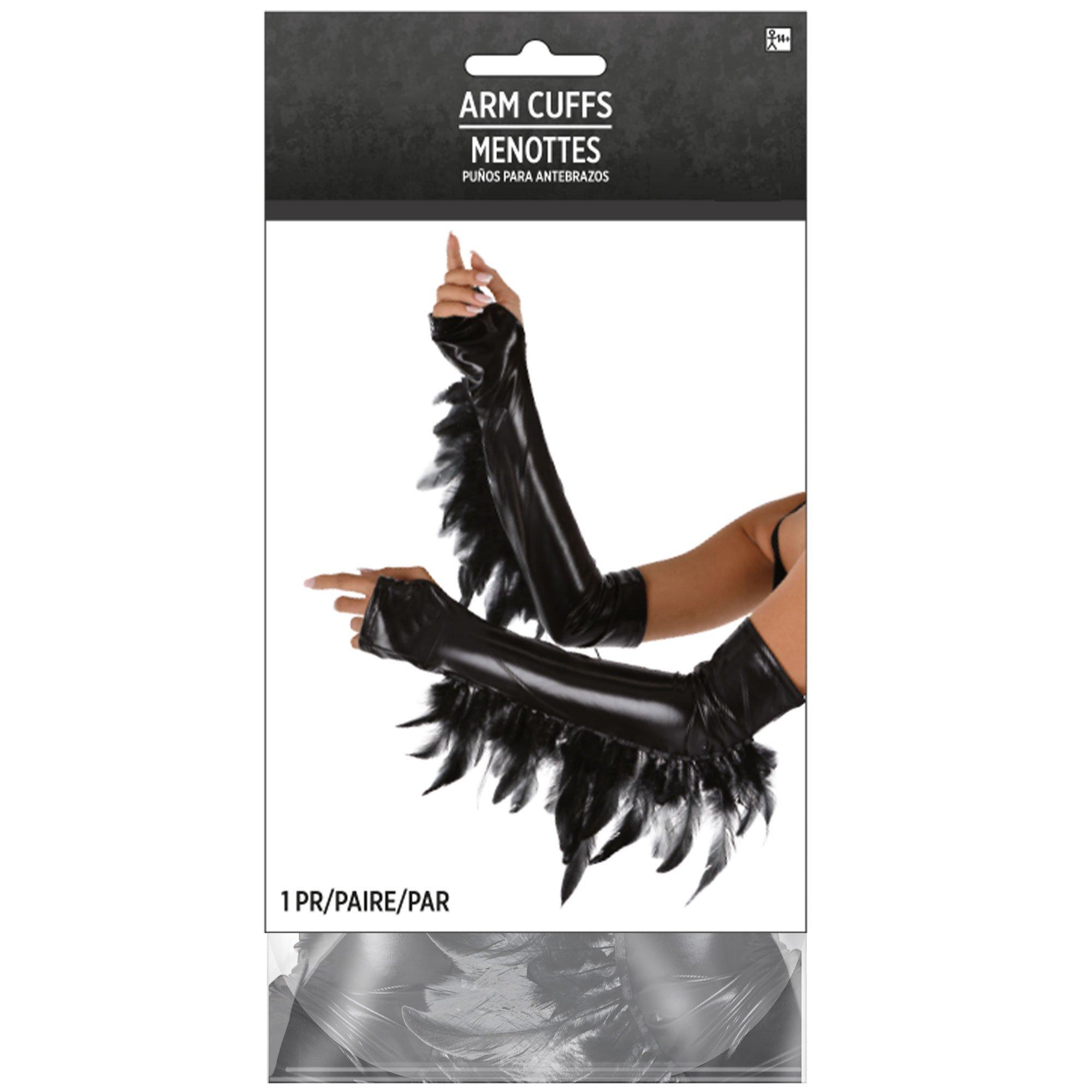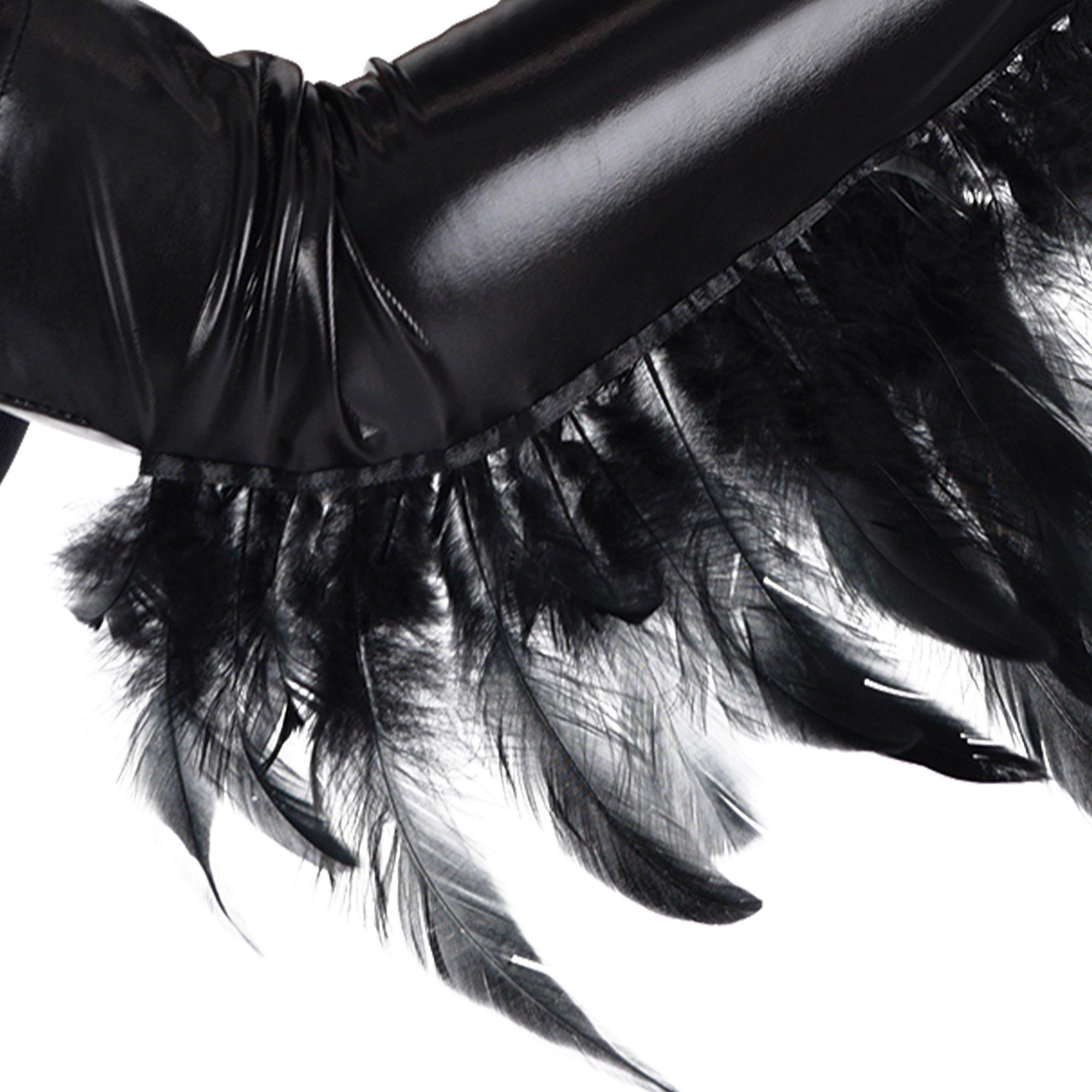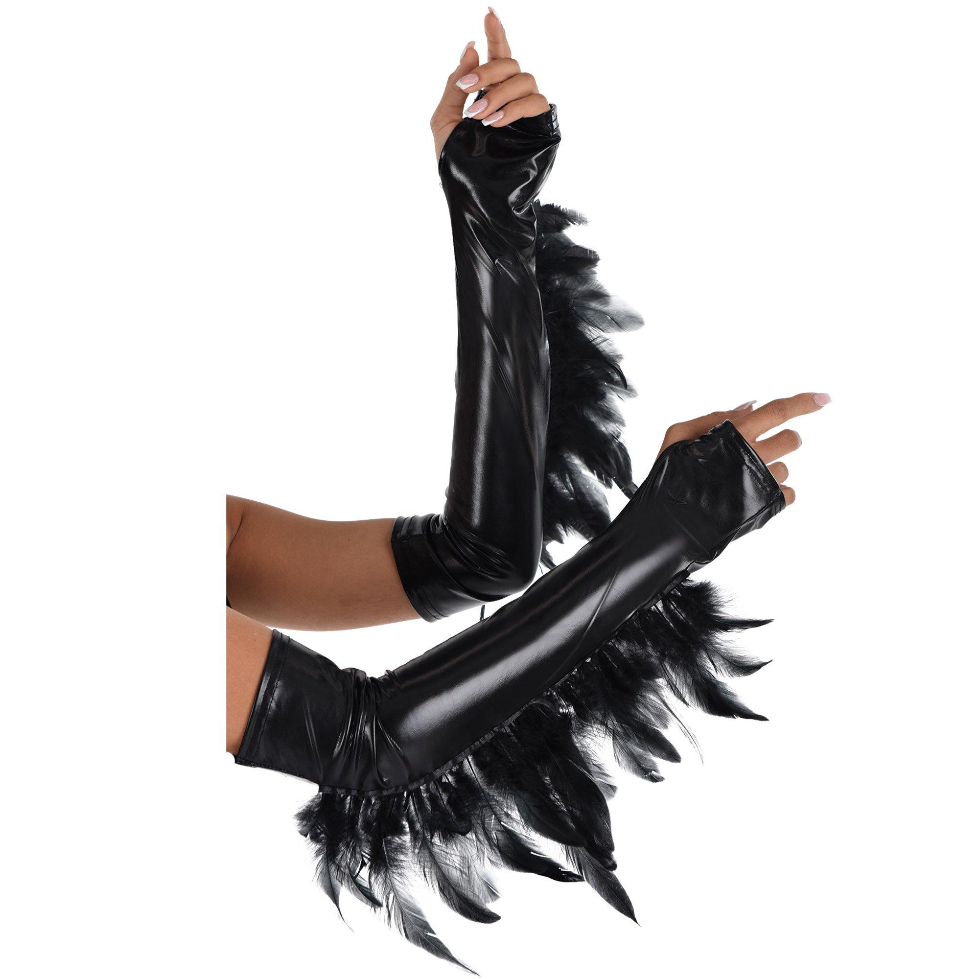 Add a little edge and a lot of style to your costume with these leather-look cuffs. The shiny opera-length accessories have convenient thumb holes and dramatic black feathers draping down under the arm.