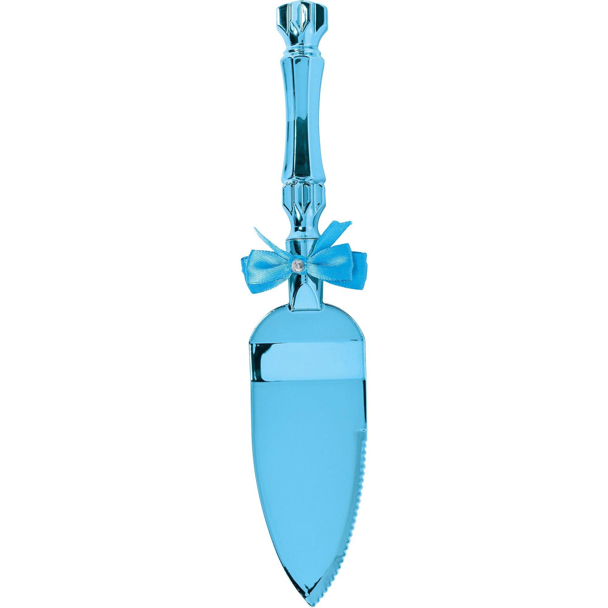 It's cake time! Serve up delicious cake at your baby shower with a Blue Cake Server! This metallic blue plastic cake server features a cute blue bow on the handle. The serrated edge makes it easy to cut the baby shower cake.