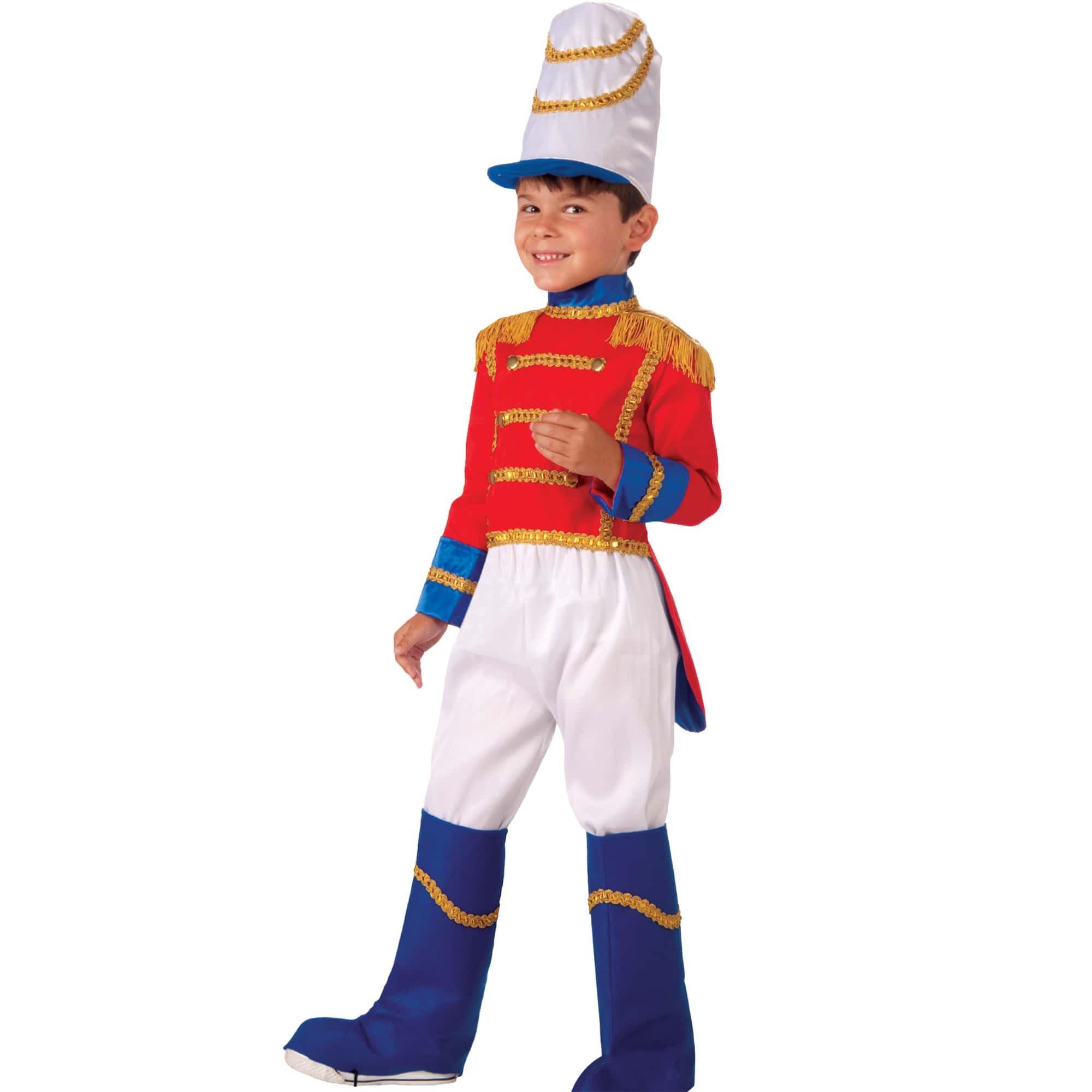 Toy soldiers are a classic during the holidays, so your little one is going to love dressing up in the Kids' Toy Soldier Costume! The outfit features a regal red jacket with golden trim and matching gold fringe hanging from the shoulders. The blue sleeve cuffs and high collar also feature accents made of gold through the center. An elegant coattail hangs in the back of the coat. The pants are white, and the included blue boot tops can fit nicely over the bottom of them. The ensemble also comes with a tall white hat, which has a small blue rim and gold trim on the top. This is a great look for Halloween, Christmas, or both, so make sure you buy this costume today for your child! If you want to accessorize further, check out our face paint so that your little one can really look like a toy solider.