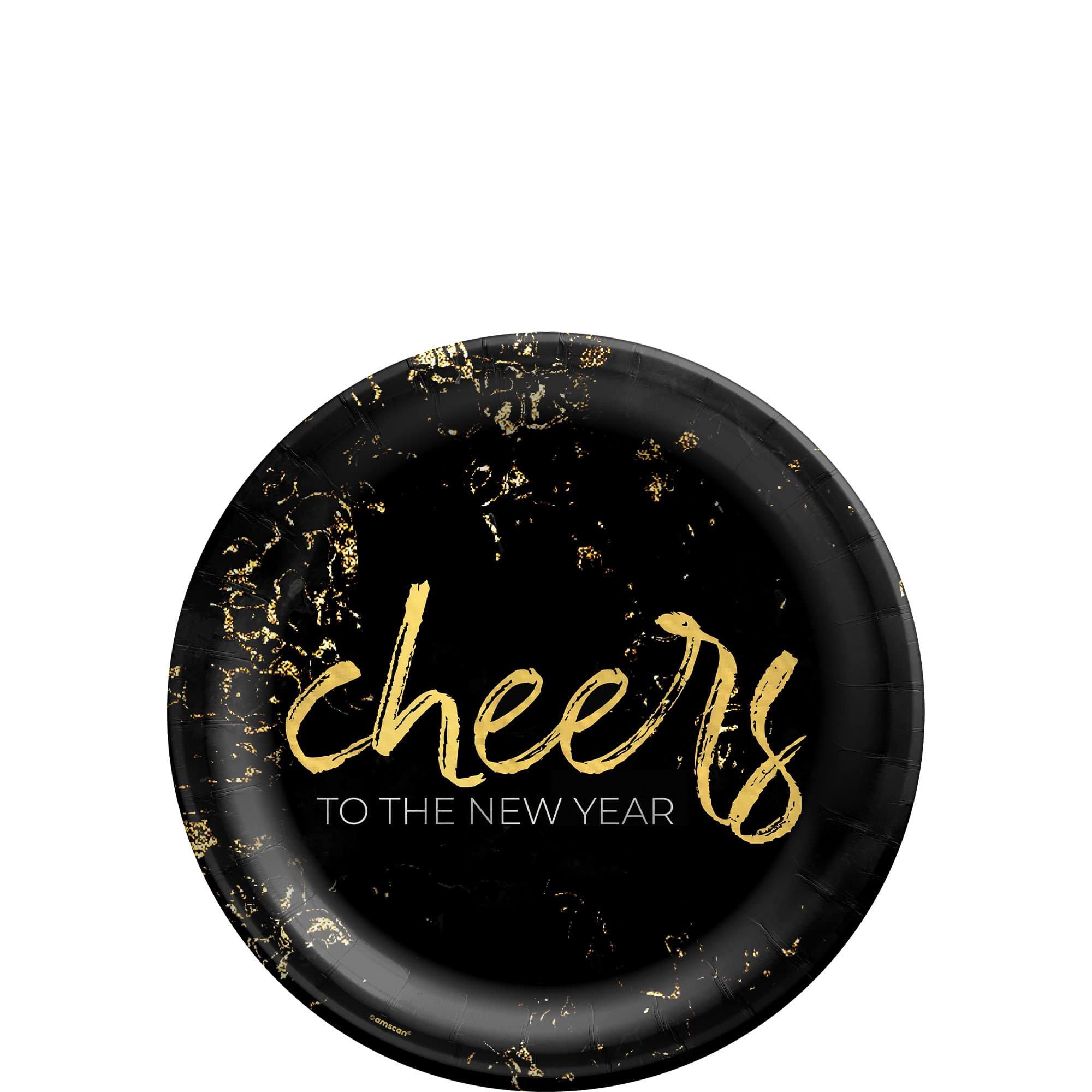 End your celebration on a sweet note with the Cheers to the New Year NYE Dessert Plates. Featuring gold “Cheers to the New Year” lettering and shimmering foil décor on a black background, these plates bring a sophisticated sparkle to your dessert or appetizer table.