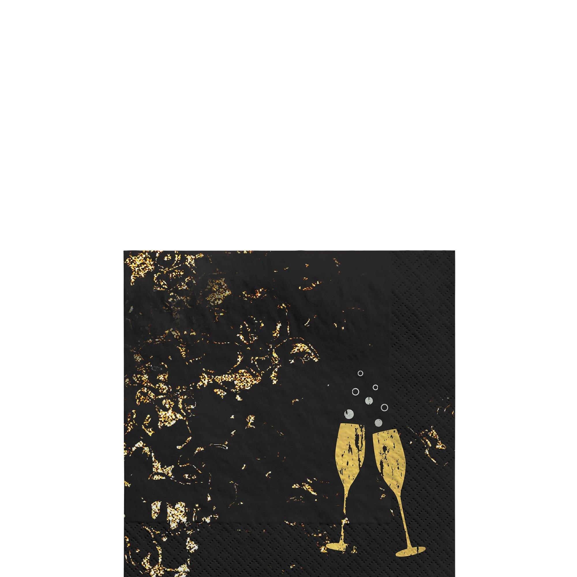 Celebrate in style with the Cheers to the New Year NYE Beverage Napkins. Featuring a gold champagne flute design on a sleek black background, these foil-accented napkins add sophistication to your toasting station or dessert table.