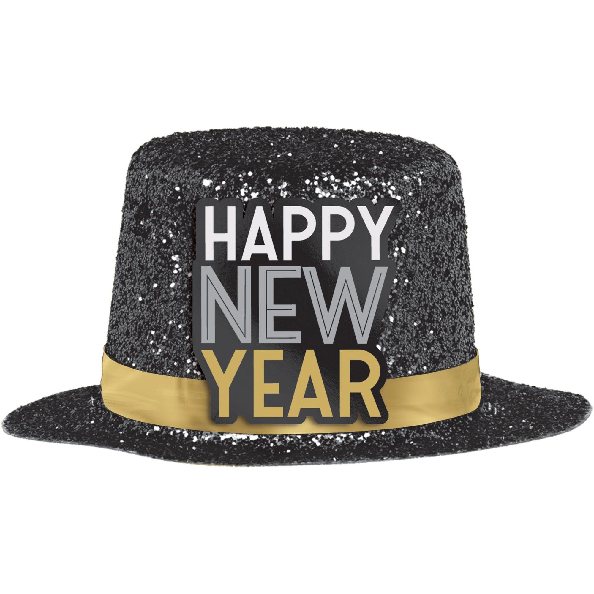 Glitter Black New Year's Mini Plastic & Cardstock Top Hat, 2in