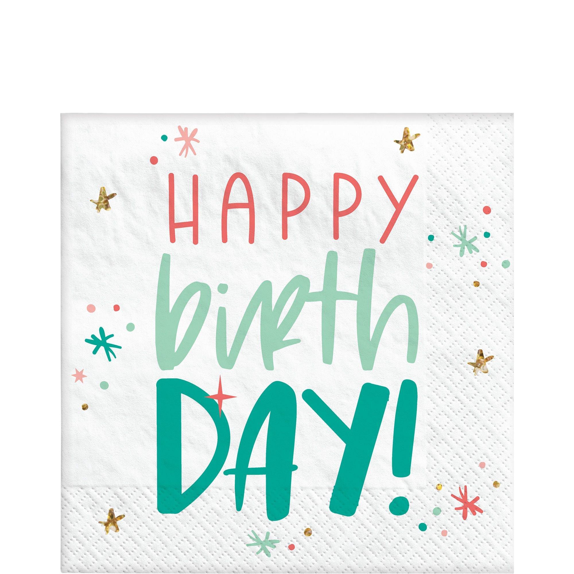 Throw a sweet birthday celebration with pink and green lunch napkins. The paper napkins have a "Happy Birthday" headline, plus confetti and stars in shades of pink and green. Two-ply paper napkins are perfect to serve with lunch and keep your party table clean!