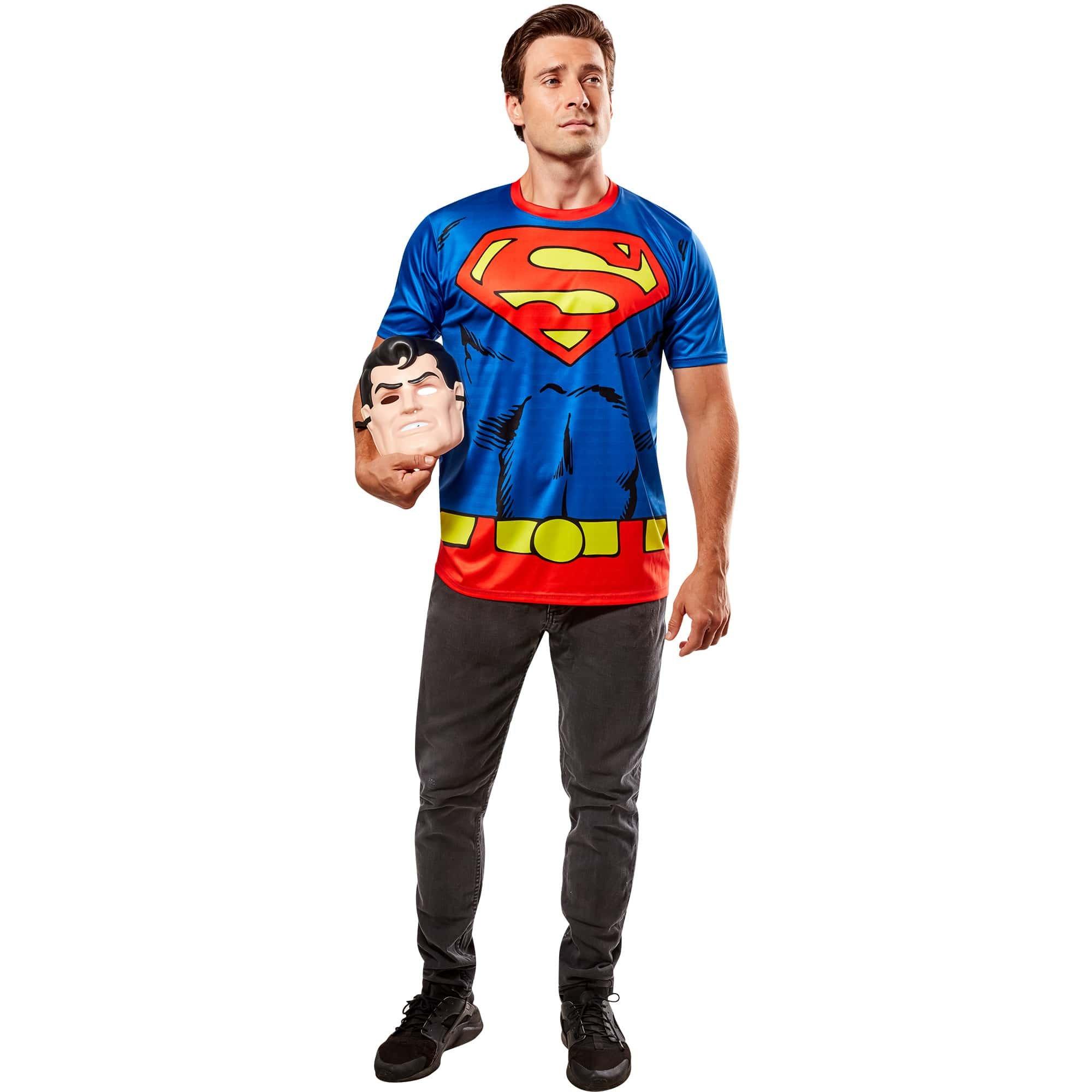 With this set, you will receive everything you need to pound your chest and keep the villains far away. Featuring a well designed Superman T shirt along with a matching Superman 1/2 mask, whether you're facing Lex Luthor, General Zod, or Darkseid, you'll be more than ready for the ensuing battle. Team up with Wonder Woman, Batman, Aquaman, and the rest of the DC Comics heroes, and there's not a villain in the world who would dare try to step to you. Pick up your Superman costume today!