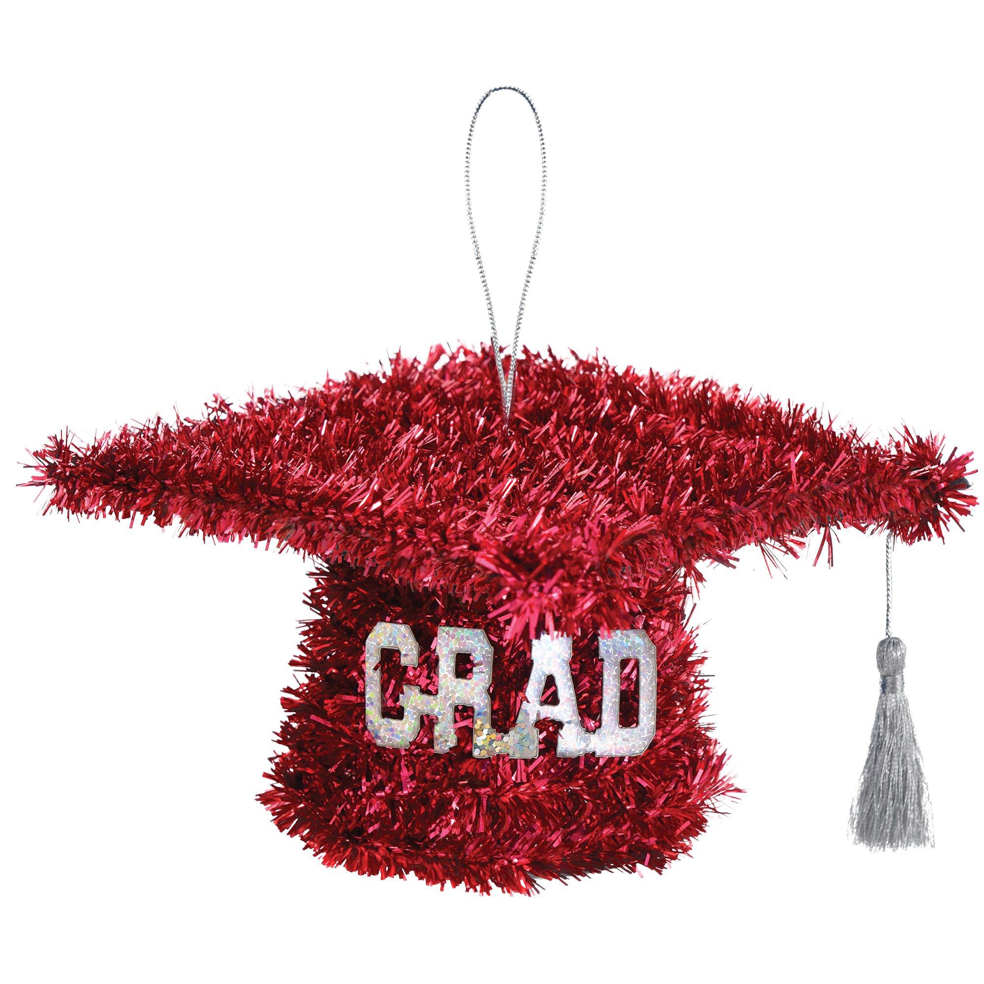 Red Graduate 2025 Cap Tinsel with Silver Tassel, 5x3in – Hanging or Table Decoration