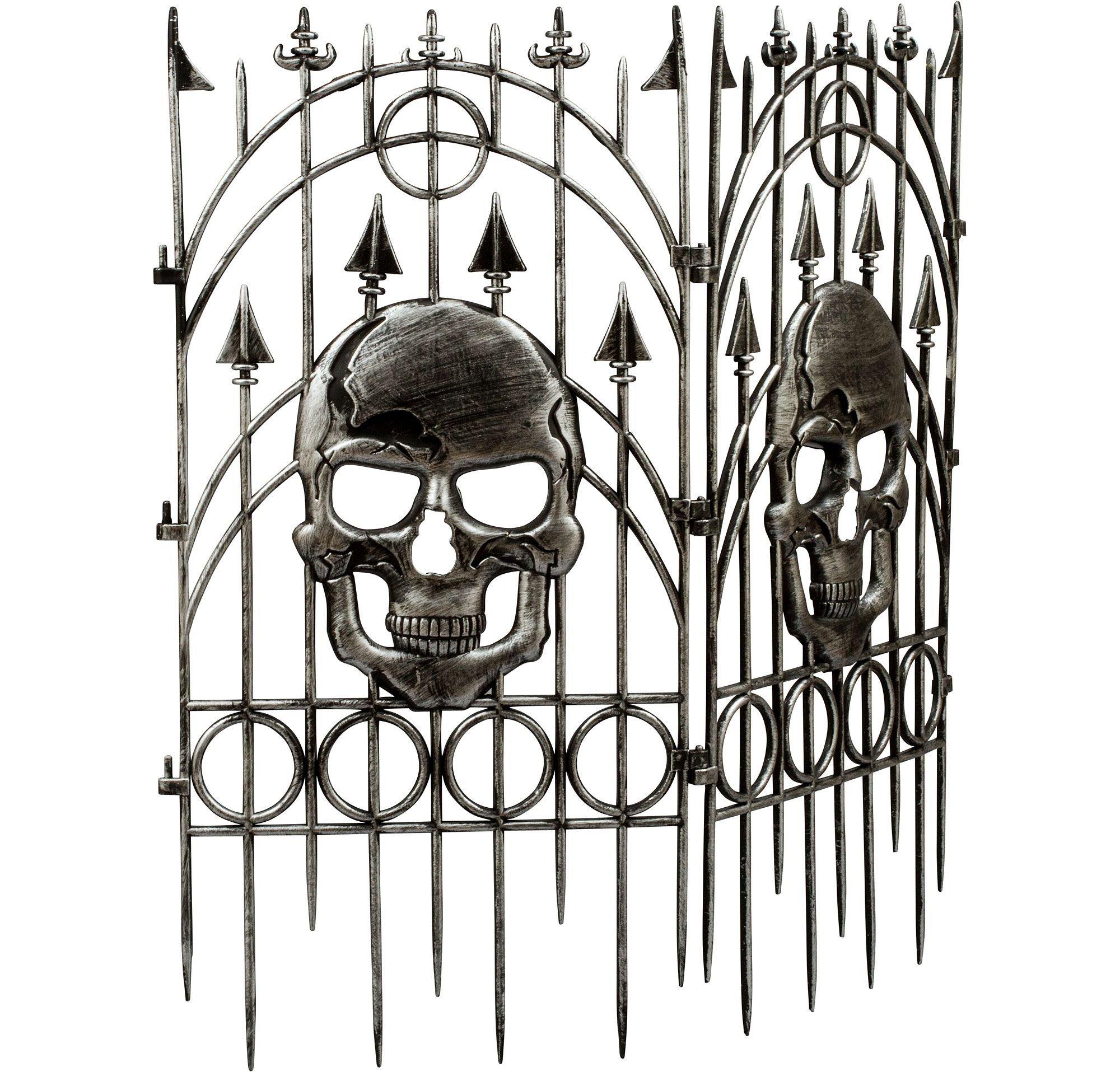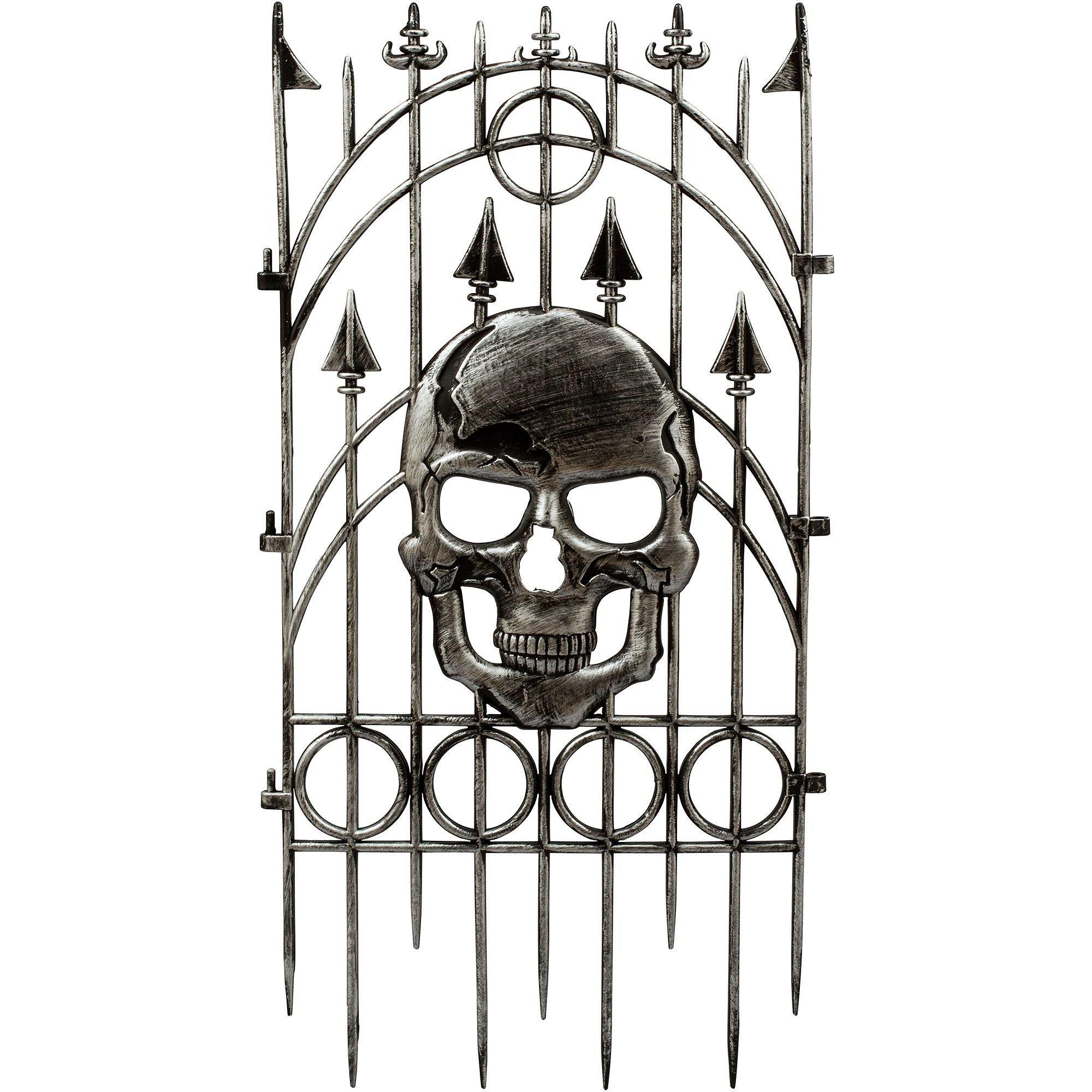 Silver Skull Fence features a large skull in the center of brushed silver looking fence with arrow detailing. Skull fence measures 36in.